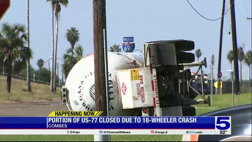 An 18-wheeler carrying liquid propane overturned in front of the Love’s Travel Stop, closing down the area, according to Combes Mayor Silvestre Garcia.
