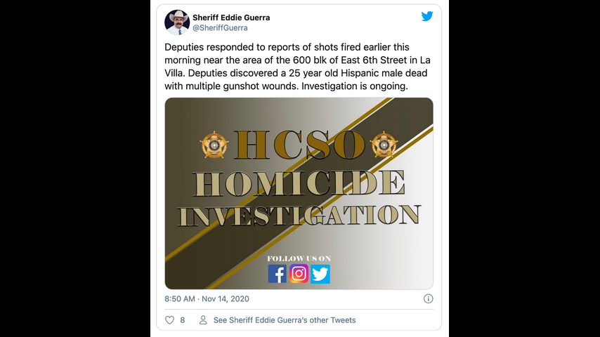 On Saturday morning, the Hidalgo County Sheriff's Office dispatched deputies to the 600 block of East 6th Street in La Villa, where someone had reported gunshots, according to a tweet from Hidalgo County Sheriff J.E. "Eddie" Guerra.
