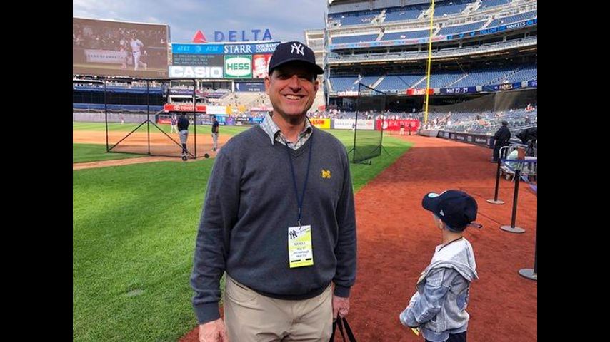 Michigan's football coach visited Yankee Stadium for the first time Friday, joined by his father and 6-year-old son to watch the Bronx Bombers take on the Tampa Bay Rays with first place in the AL East on the line.