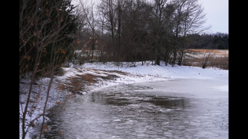 On Tuesday, a layer of ice still covered much of the small pond in a wooded area.