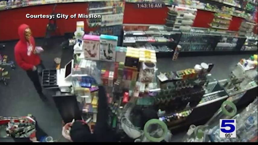 Three men stormed into the Vape city smoke shop on 219 E. Exp. 83 at about 1:45 a.m. Friday. Surveillance video from the store that the city provided showed one of the suspects pointing a gun at the store clerk while the other suspects robbed the store.