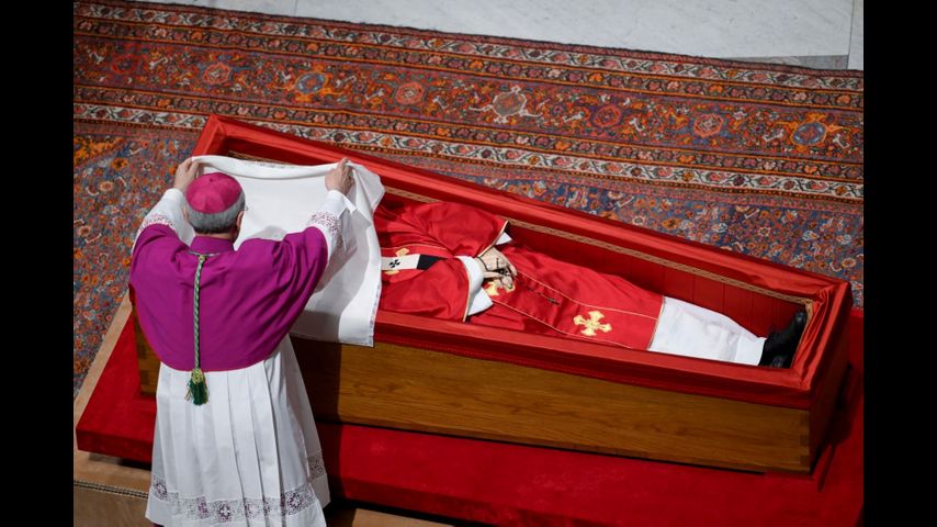 Cardinal Kevin Farrell presided over the closing and sealing of the coffin in his role of camerlengo, or interim Vatican administrator. According to photos released by the Vatican, a white cloth was placed over the pope's face, and a bag containing coins minted during his papacy was put in the coffin along with a one-page written account of his papacy.