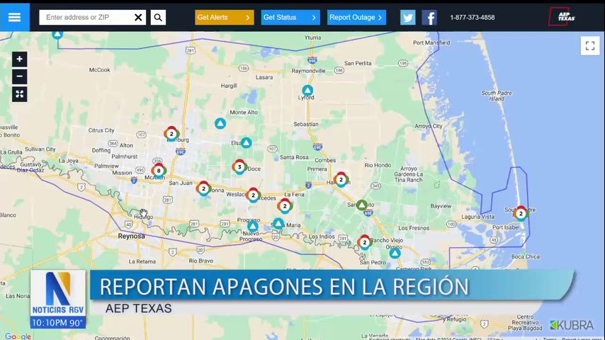 El mapa de apagones de AEP muestra que la mayoría de los apagones están en el condado de Hidalgo, donde 2.283 clientes están experimentando apagones.