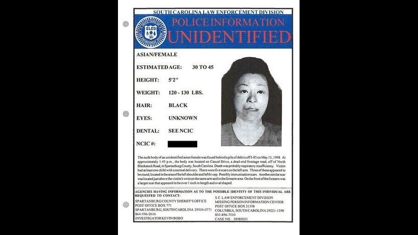 Meanwhile, deputies in South Carolina had found an unidentified woman whose nude body was dumped in the woods beside I-85 in May 1998, Spartanburg County Sheriff's Lt. Kevin Bobo said. Her hands had been bound and she had been suffocated.