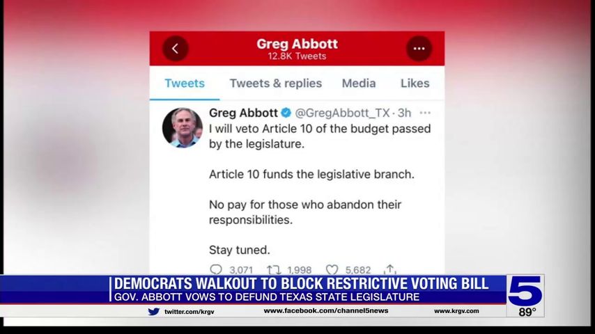 In a tweet on Monday, Gov. Greg Abbott said he would veto the article in the state budget that funds the legislative branch after Texas Democrats staged a walkout Sunday night and left the House floor, thereby missing the deadline to vote on Senate Bill 7.