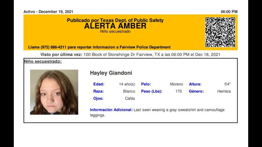 El Departamento de Policía de Fairview está buscando a Hayley Giandoni, de 14 años, quien fue vista por última vez a las 6 p.m. El sábado en la cuadra 100 de Stonehinge Dr. en Fairview, una ciudad a unas 32 millas al norte de Dallas.
