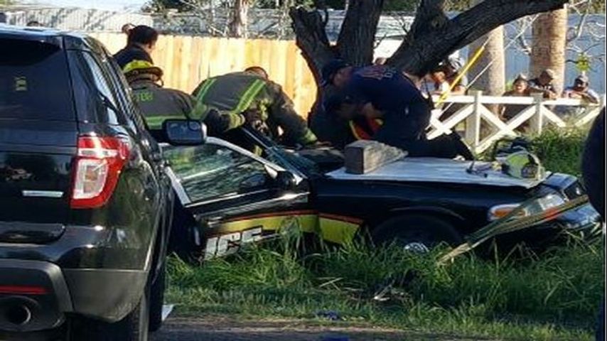 The accident occurred near 5 Mile Line and Stewart. The police vehicle hit several trees.