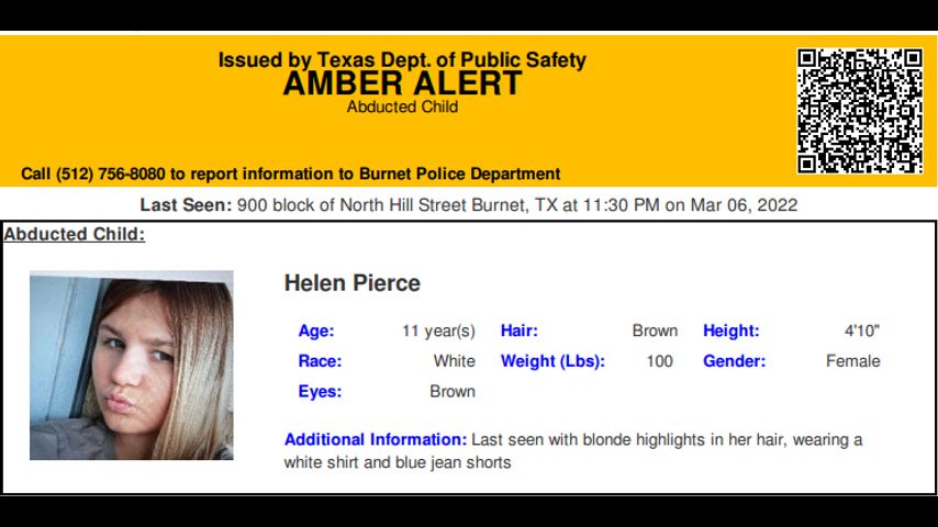 An Amber Alert was issued Tuesday night for a missing 11-year-old girl, last seen in Burnet, Texas.