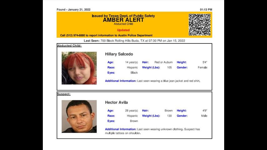 Original story: Authorities issued an Amber Alert Thursday evening for a missing 14-year-old girl last seen in Buda, Texas.