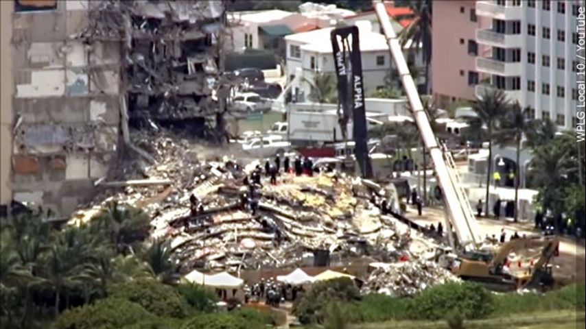 SURFSIDE, Fla. (AP) — Rescuers searching for a fifth day for survivors of a Florida condo building collapse used bucket brigades and heavy machinery Monday as they worked atop a precarious mound of pulverized concrete, twisted steel and the remnants of dozens of households.