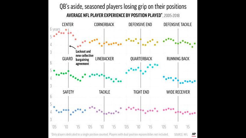 It helps explain why the experience of the average center has fallen. While every position outside of quarterback, kicker and punter has seen a decline, no position sees this sharp a drop-off in the AP survey.