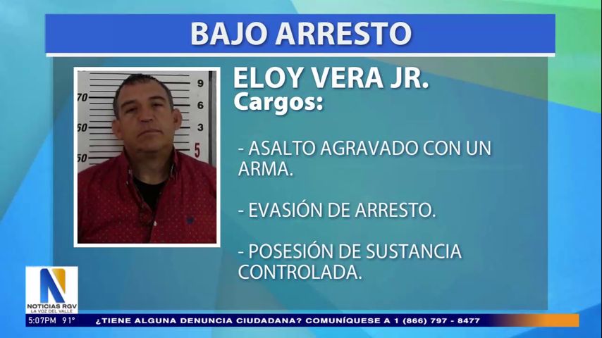 Los registros dicen que Eloy Vera Jr. fue arrestado por cargos de asalto agravado con un arma mortal, asalto impidiendo respirar, evadir el arresto y posesión de una sustancia controlada.
