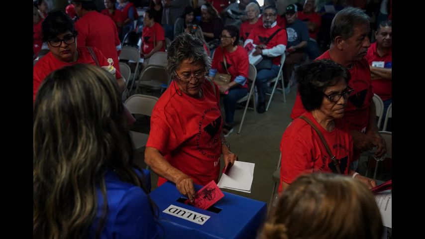 Row by row, the members lined up to slip their ballots –– rectangular pieces of red paper with the faces of Chavez and Huerta –– into large blue boxes that represented one of the resolutions. Each member could cast three ballots.