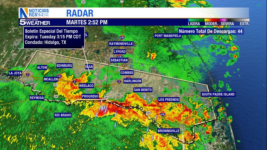 Se esperan fuertes tormentas eléctricas que se mueven al noroeste a 40 millas por hora a través del condado Cameron y el sur del condado Hidalgo, y ráfagas de viento de al menos 50 millas por hora.