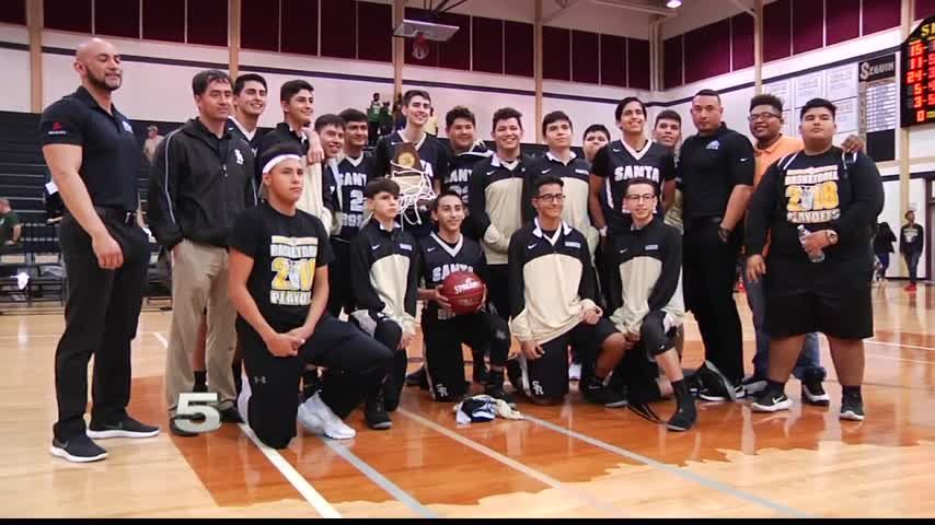 SEGUIN - After winning Friday's regional semi-final on a buzzer beating shot, the Santa Rosa Warriors played without last second heroics in defeating San Antonio Cole 80-66 to win the Region IV basketball title for the second straight year. The win earns the Warriors a return trip to the Alamodome on Thursday as one of four remaining teams in Boys' 3A basketball. CHANNEL 5's Joel Villanueva and Brandon Ortega have the wrap up on Saturday's win.