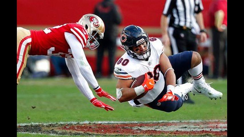 Greg Mabin recovered at the San Francisco 24 with 1:52 to play, but the Niners were unable to convert when Nick Mullens threw a deep incompletion to Marquise Goodwin on fourth-and-4 from the Chicago 45 instead of scrambling for the first down.