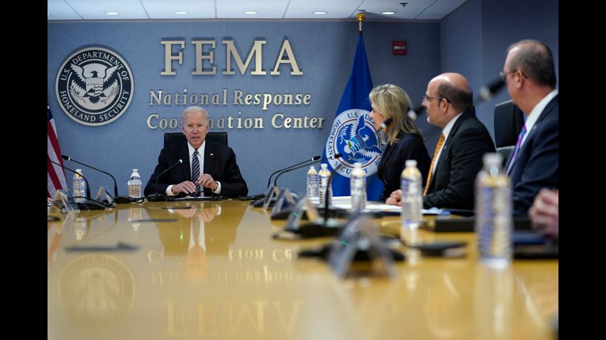 At the end of his visit to FEMA, Biden took a moment to address agency employees and thank them for their efforts in recent months. In addition to the agency's work dealing with natural disasters, FEMA is playing a central role in the federal government's effort to distribute COVID-19 vaccines in hard-to-reach areas of the country. The agency in March was also called to help support the processing of the surge of unaccompanied migrant children arriving at the U.S. southern border.