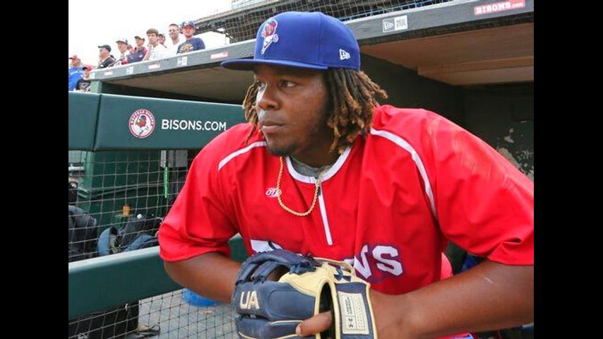 The son of Hall of Famer Vladimir Guerrero, he joined Toronto at age 16 for a $3.9 million signing bonus. He is 7 for 17 with two homers, six RBIs and no strikeouts in five games for the Bisons.