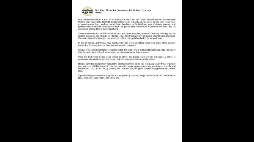 District 3 City Commissioner JP Rodriguez tells CHANNEL 5 NEWS the advisory is a precautionary measure after a water line break at the City of Weslaco Water Plant.