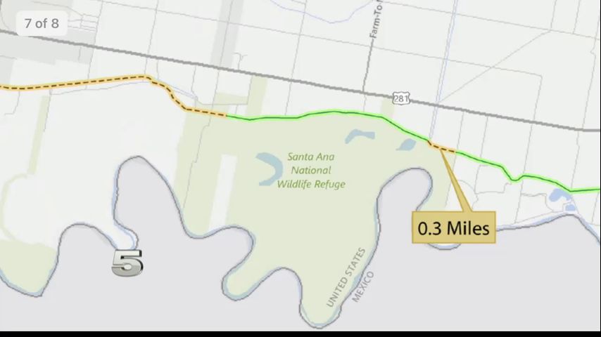 It shows a border wall is planned right up to the Santa Ana Wildlife Refuge, including natural protective areas.