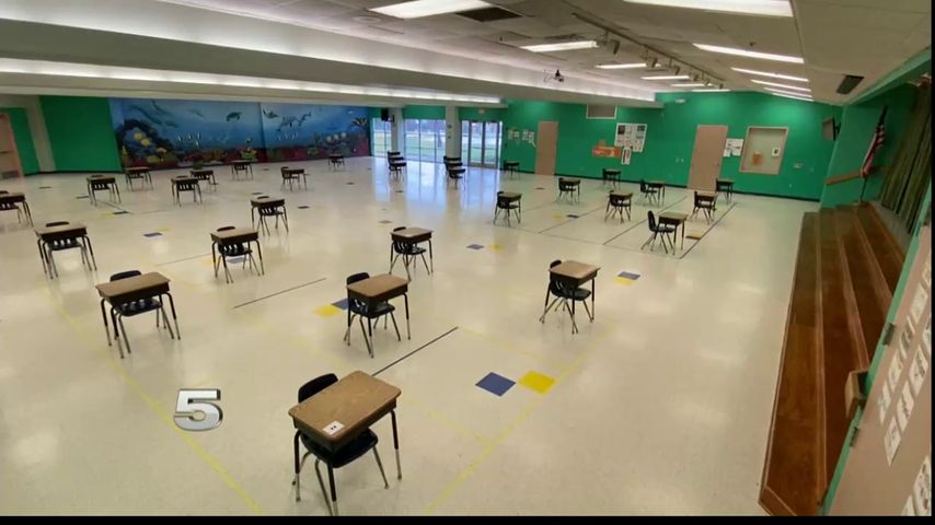 The school district taped off areas for desks in classrooms and is even using cafeterias for larger groups.