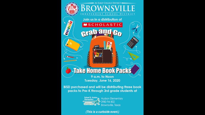 The Brownsville Independent School District will hold a curbside book distribution event from 9 a.m. to noon Tuesday at Hudson Elementary School, 2980 FM 802 in Brownsville.