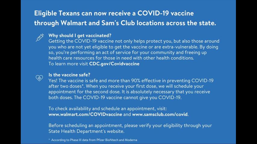 On Friday, Walmart and Sam’s Club pharmacies will begin administering COVID-19 vaccines in Texas through the U.S. Federal Retail Pharmacy Program.