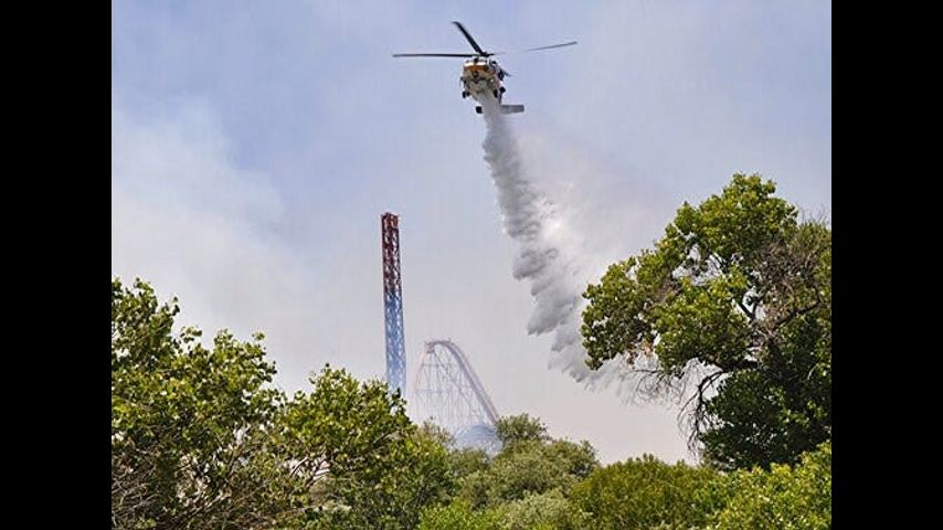 A park visitor told The Associated Press the park closed and that everyone was asked to go to the back of the 260-acre theme park, away from firefighting activity near the entrance.