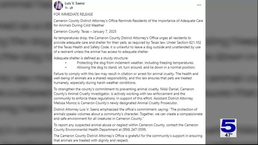 As temperatures drop across the Rio Grande Valley, the Cameron County District Attorney’s Office is urging all residents to provide adequate care and shelter for their pets, as required by Texas law.