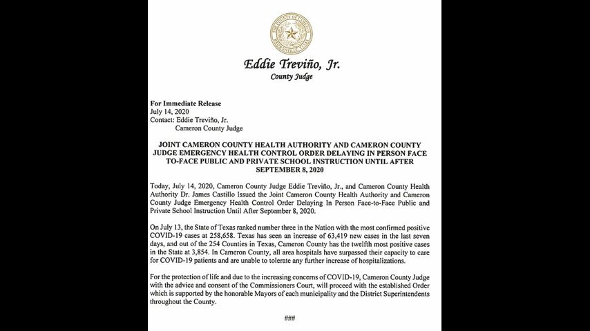 On Tuesday. Cameron County Judge Eddie Trevino Jr. and Cameron County Health Authority Dr. James Castillo issued the Joint Cameron County Health Authority and Cameron County Judge Emergency Health Control Order delaying in person face-to-face public and private school instruction until after September 8, 2020.
