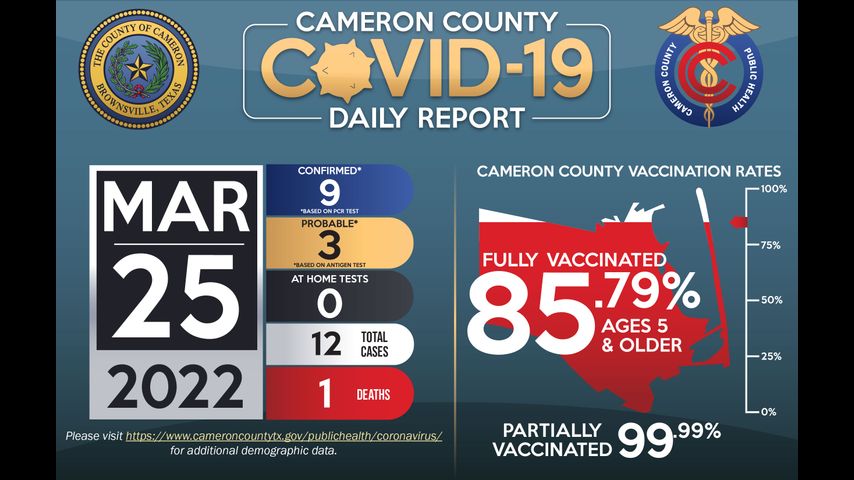 Vaccination efforts continue across Cameron County; currently, 85.79% of the population five years and older is fully vaccinated.