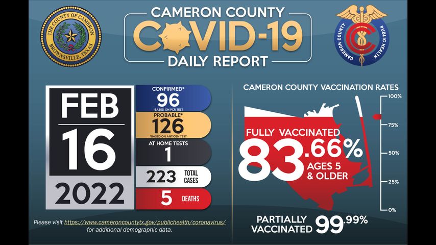 Vaccination efforts continue across Cameron County; currently, 83.66% of the population five years and older is fully vaccinated.