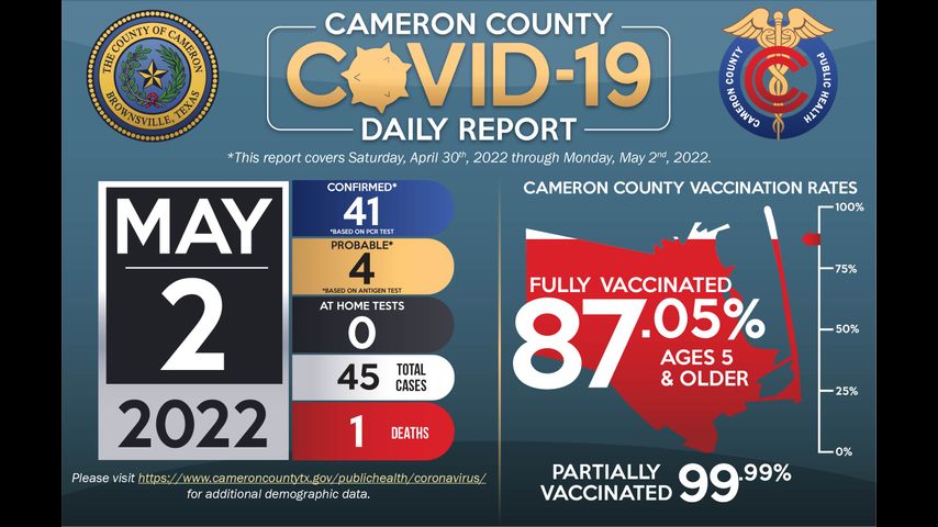 Vaccination efforts continue across Cameron County; currently, 87.05% of the population five years and older are fully vaccinated.