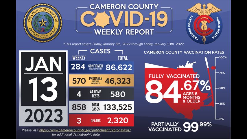 Vaccination efforts continue across Cameron County; currently 82.52% of the population six months and older are fully vaccinated and 99.99% has received at least one dose. In addition, 93.61% of the population 65 years and older is fully vaccinated and 99.99% has received one dose.