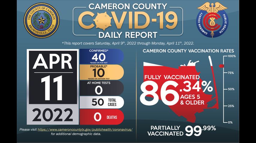 Vaccination efforts continue across Cameron County; currently, 86.34% of the population five years and older are fully vaccinated.