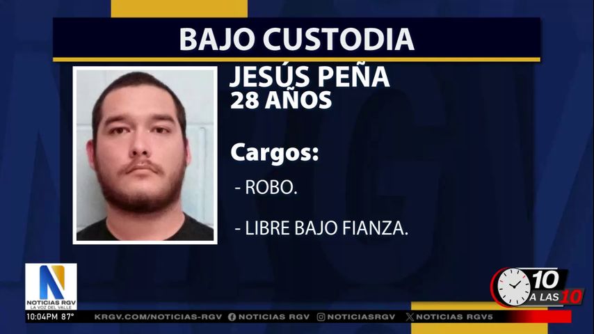 Jesús Abiel Peña fue identificado por la policía como el sospechoso en la investigación del robo. Los registros de la cárcel muestran que Peña fue fichado en la cárcel del condado Hidalgo el lunes por un cargo de robo. La fianza se fijó en $3.000.