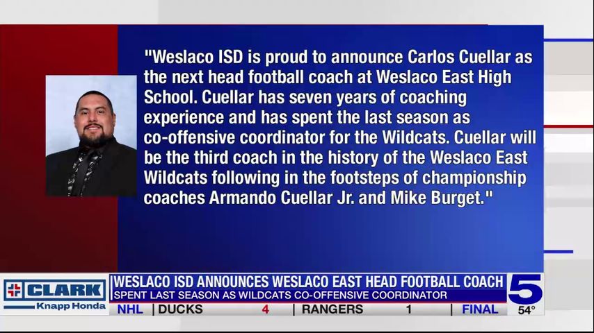 "Weslaco ISD is proud to announce Carlos Cuellar as the next head football coach at Weslaco East High School. Cuellar has seven years of coaching experience and has spent the last season as co-offensive coordinator for the Wildcats. Cuellar will be the third coach in the history of the Weslaco East Wildcats following in the footsteps of championship coaches Armando Cuellar Jr. and Mike Burget. Cuellar was approved by the Weslaco ISD school board tonight." Weslaco ISD Facebook