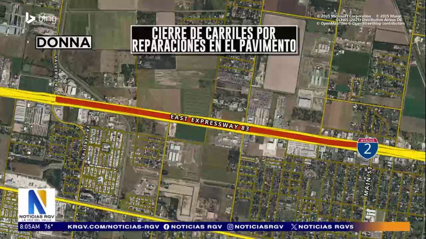 El Departamento de Transporte de Texas (TxDOT) tiene cerrada una porción de la Interestatal 2 en Donna, en dirección este, por reparaciones en el pavimento por las noches.