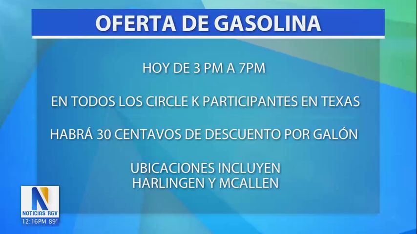 Hoy anuncian que la tienda, Circle K tiene una oferta en el consumo de gasolina de 30 centavos de descuento por galón entre las 3 y las 7 p.m. hora local durante.