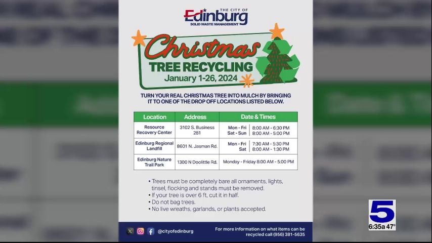 "By participating in this initiative, Edinburg residents contribute to the city's sustainability efforts, reducing waste and promoting a greener community. The recycled trees will be chipped into mulch, which will then be repurposed for landscaping and conservation projects," Lerma said in a news release.