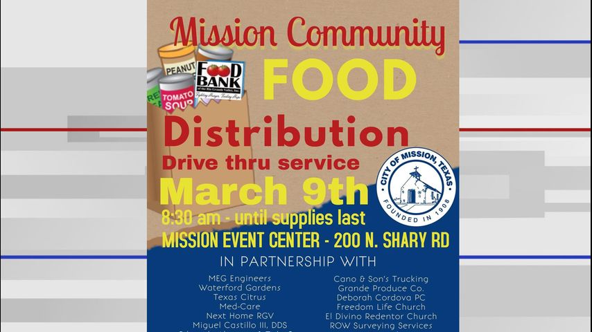 The Mission Community Food Distribution drive-thru service will be held on March 9 starting at 8:30 a.m., according to a social media post from the city.
