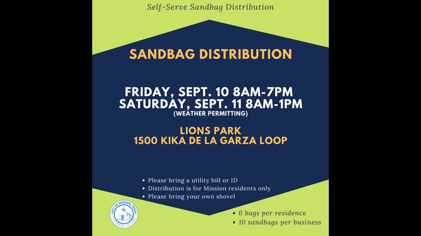 The sandbag distribution opens Friday, Sept. 10 and will run from 8 a.m. through 7 p.m. at Lions Park, located on 1500 Kika de la Garza Loop.