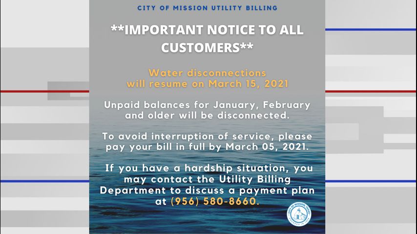 "Water is a critical resource and no Mission resident was left without access to clean water,” said Mission City Manager Randy Perez. “We also waived all credit card fees to help our constituents, but as the city and state slowly reopen, we need to return to normal operations and disconnections will resume."
