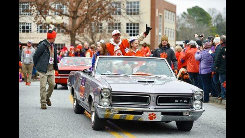 On a chilly, overcast morning, Clemson celebrated its second national football title in three seasons Saturday before thousands of roaring fans. Spectators stood seven or eight deep along the parade route.