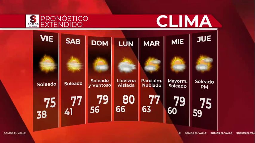 Para el día de hoy se pronostica soleado con temperaturas máximas en cerca de 72 grados.Los vientos serán del oeste a razón de cerca de 6 millas por hora,siendo varibles y ligeros durante la tarde.