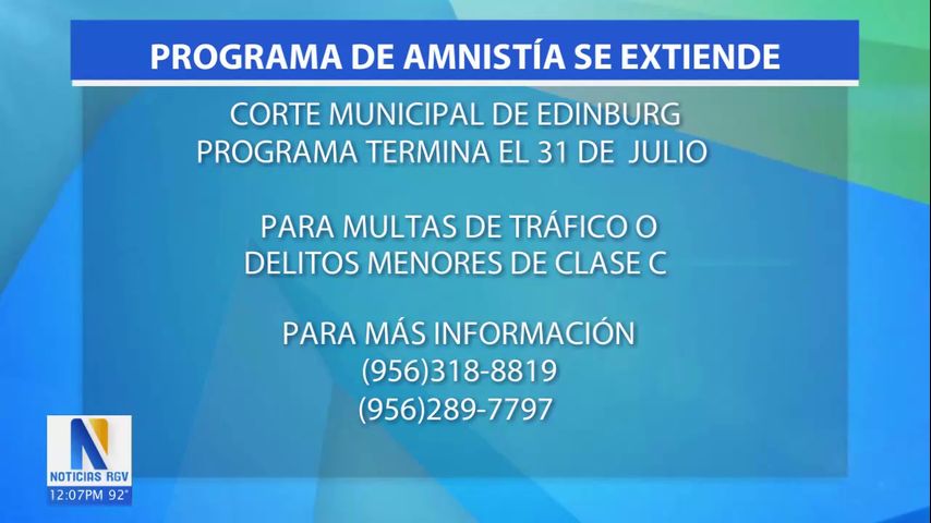 La corte municipal de Edinburg ha decidido extender el programa de amnistía hasta el próximo 31 de julio. Si usted tiene una multa de tráfico pendiente o ha cometido una infracción menor de clase C, esta es una oportunidad para pagar la sanción o hacer arreglos de pago.