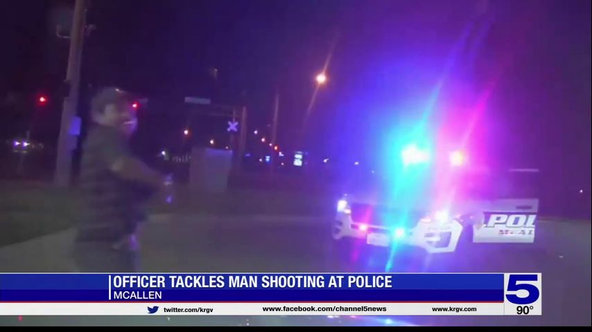 Dramatic dashcam video shared by the McAllen Police Department shows the moment a police officer tackled a man who pulled out a gun from his waistband during a confrontation Thursday night.