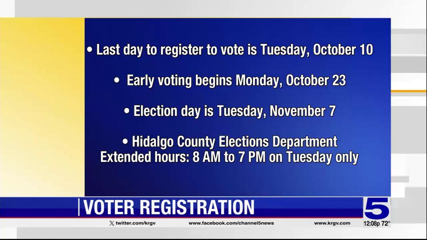 The Hidalgo County Elections Department's main office will be extending their office hours to help residents register. The office will open from 8 a.m. to 7 p.m. Tuesday.