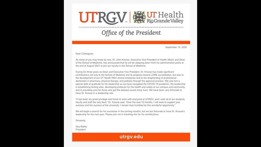 Dr. John H. Krouse, Dean of the UTRGV School of Medicine and Executive Vice President for Health Affairs announced he will be stepping down from his administrative posts at the end of August 2021 to become part of the faculty in the School of Medicine.