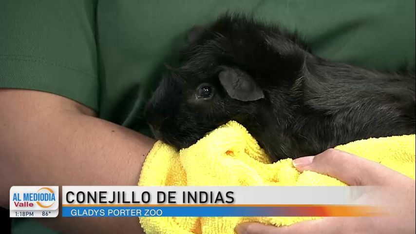 Alejandra Rodríguez, coordinadora de marketing de Gladys Porter Zoo, visita Noticias RGV para presentar al conejillo de Indias proveniente de los Andes de América del Sur.